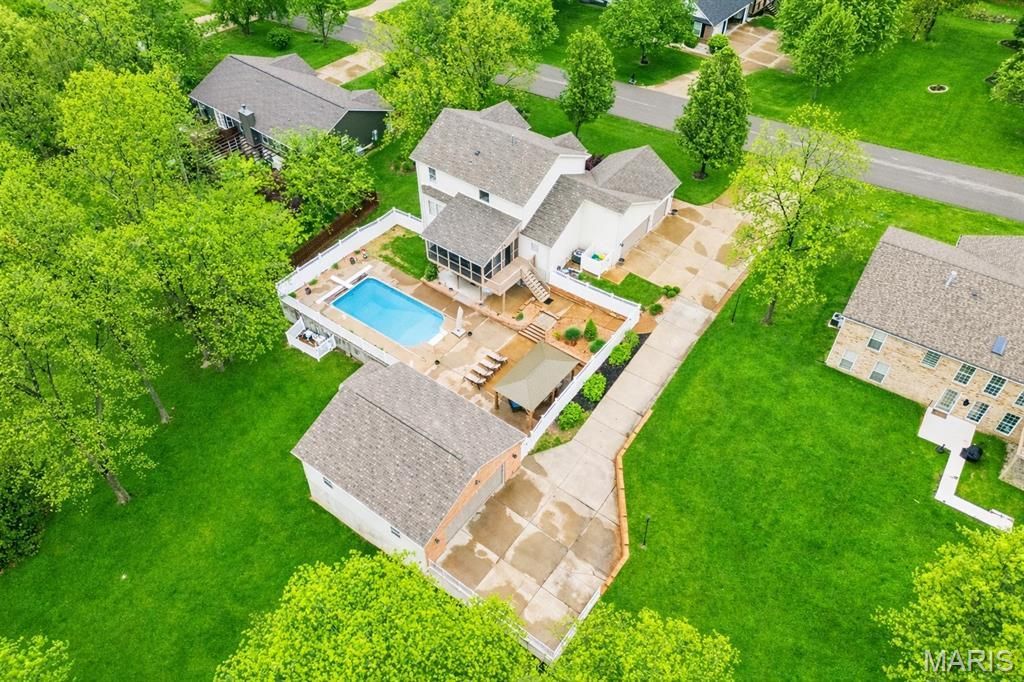 Designed for entertaining both inside and out, this stunning 2-story home offers 4 bedrooms, 3.5 baths, and an impressive lineup of amenities. Step into your own private retreat featuring a 16x32 heated saltwater in-ground pool with retractable cover, gazebo with firepit, expansive patio, and hot tub-all overlooking a serene, stocked pond. Car enthusiasts and hobbyists will appreciate not only the 3-car attached heated garage, but also the 32x36 detached garage complete with HVAC-the ultimate man cave or workshop space. Inside, the home showcases 9-foot ceilings on the main level, a formal dining room, and a versatile living room/den with elegant French doors. The spacious great room features a cozy gas fireplace and flows seamlessly with beautiful hardwood flooring throughout. The well-appointed kitchen includes a center island, abundant cabinetry, pantry with custom organization, and an adjoining breakfast room. Enjoy year-round views from the 19x14 screened-in porch overlooking the backyard oasis. Main floor laundry adds convenience. Upstairs, the expansive primary suite offers custom closet organizers and a spa-like bath with soaking tub, double vanity, and walk-in shower. Two additional bedrooms complete the upper level. The finished walk-out lower level is just as impressive, featuring a large recreation area, full bath, and a fourth bedroom currently used as a workout room-all leading to a covered patio and hot tub. Manicured grounds with sprinkler system and landscape lighting complete this exceptional property. A rare blend of comfort, function, and resort-style living-ready to impress.